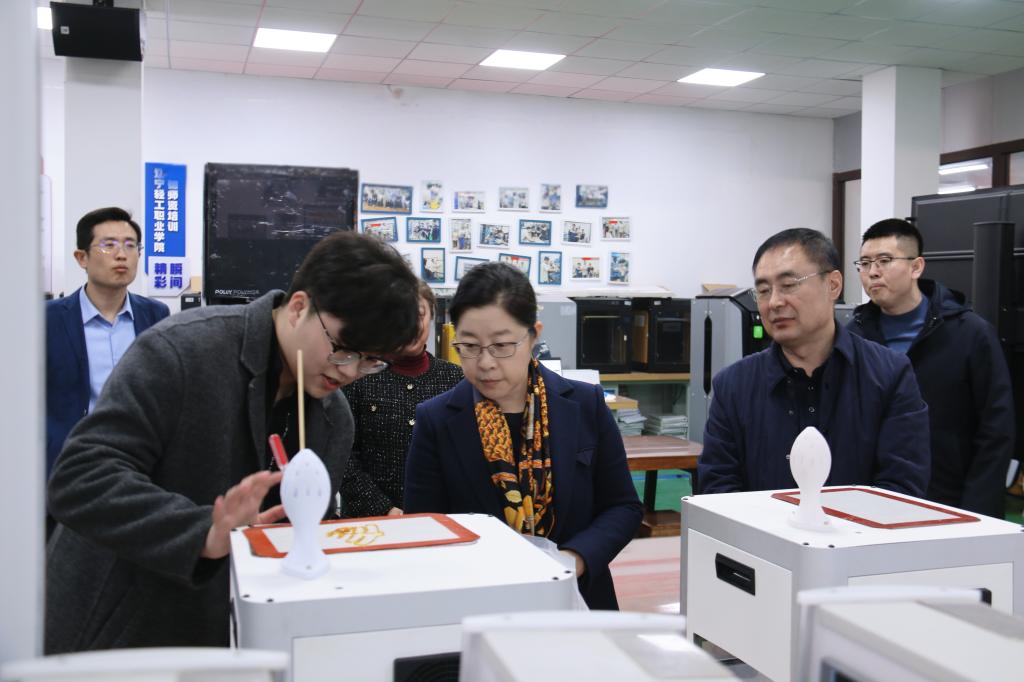 在3D打印实训区,校领导仔细询问3D建模、参数设置、作品成型等全流程制作工艺。在三轴、四轴机床实训区,校领导详细了解相关专业的校企合作及课程共建情况。