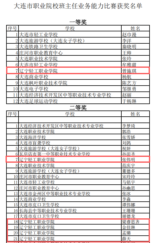 近日,在大连市教科文卫体工会联合大连市教育局职业教育与成人教育处、大连市职业教育工会联合会共同主办的2025年大连市职业院校班主任业务能力比赛中,我校辅导员以卓越的业务素养和扎实的育人实践能力,在全市众多参赛选手中表现突出,喜获佳绩!